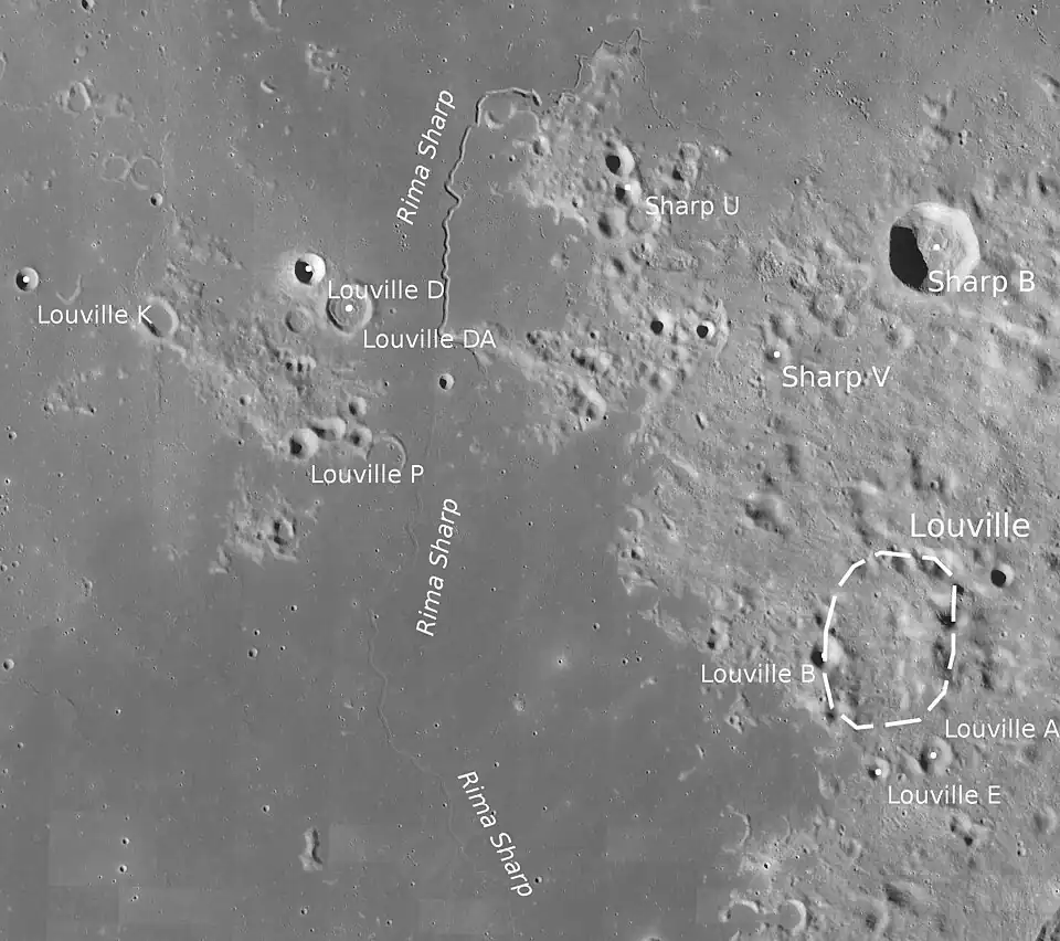 To the west across the lunar mare is a long, slender rille designated Rima Sharp. This follows a generally north–south route, beginning to the north-northwest of Louville and continuing until it terminates to the south-southwest. The total diameter of this formation is 107 km.