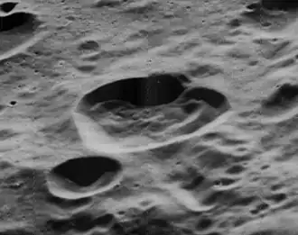 Lovell is a small lunar impact crater that lies across the eastern edge of the walled plain Apollo, on the far side of the Moon. It has a somewhat irregular shape, with outward bulges to the north and west. The rim is sharp-edged, with some slight wear along the northwestern bend. The featureless inner walls slope directly down to the uneven interior floor.