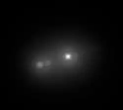 The difference between the seeing limited image (third image from top) and the best 1% images selected result is quite remarkable: a triple system has been detected. The brightest component in the West is a V=14.9 magnitude M4V star. This component is the lucky imaging reference source. The weaker component consists of two stars of spectral classes M4.5 and M5.5.[2] The distance of the system is about 45 parsecs (pc). Airy rings can be seen, which indicates that the diffraction limit of the Calar Alto Observatory's 2.2 m telescope was reached. The signal to noise ratio of the point sources increases with stronger selection. The seeing halo on the other side is more suppressed. The separation between the two brightest objects is around 0.53 arcsec and between the two faintest objects less than 0.16 arcsec. At a distance of 45 pc this corresponds to 7.2 times the distance between Earth and Sun, around 1 billion kilometers (109 km).