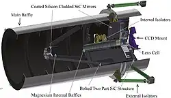 - L'Ralph – panchromatic and color visible imager (0.4–0.85 μm) and infrared spectroscopic mapper (1–3.6 μm). L'Ralph is based on the Ralph instrument on New Horizons and was built at Goddard Space Flight Center. It will be used to measure silicates, ices, and organics at the surface. The L'Ralph instrument has a three-mirror anastigmat design f/6 with a 75 mm aperture. The telescope structure is composed from one aluminum block to provide an athermal imaging system. A beamsplitter transmits the longer wavelength light to LEISA and reflects light short of ~960 nm to MVIC. The instrument is passively cooled with a 20-inch (510 mm) diameter radiator that cools the LEISA detector to ~100 K. A new component of the L'Ralph instrument compared with its predecessors is a scan mirror assembly. The scan mirror is used to sweep the target across the Ralph focal planes to build up either visible images or infrared spectra.[34]
