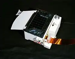 As gas molecules enter the experiment's aperture, they are ionised by electron bombardment. These gas ions are then collimated into a beam and passed through a magnetic analyser to the detector.[3] The electron-ion sources consist of two filaments, composed of 99% tungsten and 1% rhenium.[4] Multiple ion mass-ranges could be scanned simultaneously by varying the voltage across the electron-ion source. Each mass range had an independent system for counting ions. Each system consisted of an electron multiplier, pulse amplifier, discriminator and counter.[3] The experiment could detect ions of 28 and 64 atomic mass units at the same time, enabling the simultaneous measurement of carbon monoxide and sulphur dioxide.[3]