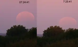A selenelion or selenehelion, also called a horizontal eclipse, occurs where and when both the Sun and an eclipsed Moon can be observed at the same time. The event can only be observed just before sunset or just after sunrise, when both bodies will appear just above opposite horizons at nearly opposite points in the sky. A selenelion occurs during every total lunar eclipse—it is an experience of the observer, not a planetary event separate from the lunar eclipse itself. Typically, observers on Earth located on high mountain ridges undergoing false sunrise or false sunset at the same moment of a total lunar eclipse will be able to experience it. Although during selenelion the Moon is completely within the Earth's umbra, both it and the Sun can be observed in the sky because atmospheric refraction causes each body to appear higher (i.e., more central) in the sky than its true geometric planetary position.[13]