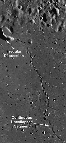 The existence of a lava tube is sometimes revealed by the presence of a "skylight", a place in which the roof of the tube has collapsed, leaving a circular hole that can be observed by lunar orbiters.[3][4]