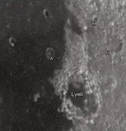 By convention these features are identified on lunar maps by placing the letter on the side of the crater midpoint that is closest to Lyell.