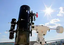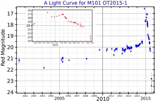 M101 OT2015-1 was discovered on February 10, 2015 by Dumitru Ciprian Vîntdevară from Planetarium and Astronomical Observatory of the Museum Vasile Pârvan in Bârlad, România. The transient is located in the outer reaches of a spiral arm of M101, at 489W and 324N of the measured position of the galaxy nucleus.[5][6][7] The transient was discovered with a Newtonian telescope 0,2 m + CCD camera ATIK 320E (on unfiltered) + EQ6 mount. On February 13, 2015, the New Zealand astronomer Stu Parker, using a telescope located in Spain, confirmed that a new object was visible in the M101 galaxy. The new object was initially reported as a possible supernova, with the designation PSN J14021678+5426205. Later it was shown that the new star is not a supernova, and for a while its nature remained uncertain.[5] One month after the discovery, on March 11, 2015, an Astronomer's Telegram was published where the new star was described as a luminous red nova, confirmed spectroscopically.[8]