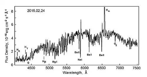 - ↑ V. P. Goranskij; D. V. Cherjasov; B. S. Safonov; O. V. Vosyakova; E. A. Barsukova; O. I. Spiridonova; A. F. Valeev (2015). "Spectroscopy and photometry of the luminous red nova PSN J14021678+5426205 in M 101". The Astronomer's Telegram. 7206: 1. Bibcode:2015ATel.7206....1G.