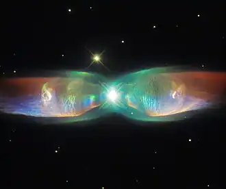 The nebula has inflated dramatically[5] due to a fast stellar wind, blowing out into the surrounding disk and inflating the large, wispy hourglass-shaped wings perpendicular to the disk. These wings produce the butterfly appearance when seen in projection. The outer shell is estimated to be about 1,200 years old (Schwarz et al. 1997).