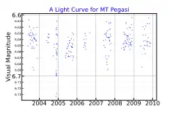 ![]() Visual light curve of MT Pegasi from observations by the All Sky Automated Survey between 2003 and 2009.[1] | |