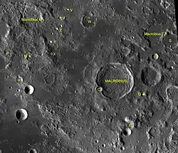 By convention these features are identified on lunar maps by placing the letter on the side of the crater midpoint that is closest to Macrobius.