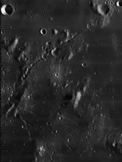 Maestlin is a small, bowl-shaped impact crater located near the eastern edge of the lunar Oceanus Procellarum. It was named after German mathematician Michael Maestlin.[1] To the east lies the crater Encke and to the northeast is Kepler. Just to the southeast of Maestlin is the curved, ridge-like remains of Maestlin R, a walled plain that has been almost completed submerged by the mare. South of this feature is a system of linear rilles named Rimae Maestlin. The mare surface around Maestlin is dusted with ray material from Kepler.
