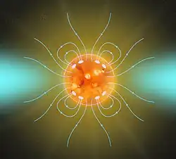 Ionized material captured by the magnetic field lines will rotate with the Sun as if it were a solid body. As material escapes from the Sun due to the solar wind, the highly ionized material will be captured by the field lines and rotate with the same angular velocity as the Sun, even though it is carried far away from the Sun's surface, until it eventually escapes. This effect of carrying mass far from the centre of the Sun and throwing it away slows down the spin of the Sun.[1][2] The same effect is used in slowing the spin of a rotating satellite; here two wires spool out weights to a distance slowing the satellites spin, then the wires are cut, letting the weights escape into space and permanently robbing the spacecraft of its angular momentum.