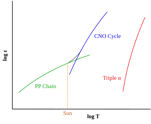 At a stellar core temperature of 18 million kelvin, the PP process and CNO cycle are equally efficient, and each type generates half of the star's net luminosity. As this is the core temperature of a star with about 1.5 M☉, the upper main sequence consists of stars above this mass. Thus, roughly speaking, stars of spectral class F or cooler belong to the lower main sequence, while A-type stars or hotter are upper main-sequence stars.[16] The transition in primary energy production from one form to the other spans a range difference of less than a single solar mass. In the Sun, a one solar-mass star, only 1.5% of the energy is generated by the CNO cycle.[32] By contrast, stars with 1.8 M☉ or above generate almost their entire energy output through the CNO cycle.[33]