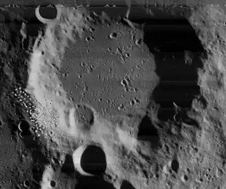 ![]() Lunar Orbiter 4 image with north at top. (Group of dots in lower left is blemish on original image) | |