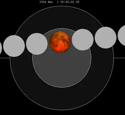 A total lunar eclipse occurred on 1 March 1504, visible at sunset for the Americas, and later over night over Europe and Africa, and near sunrise over Asia.