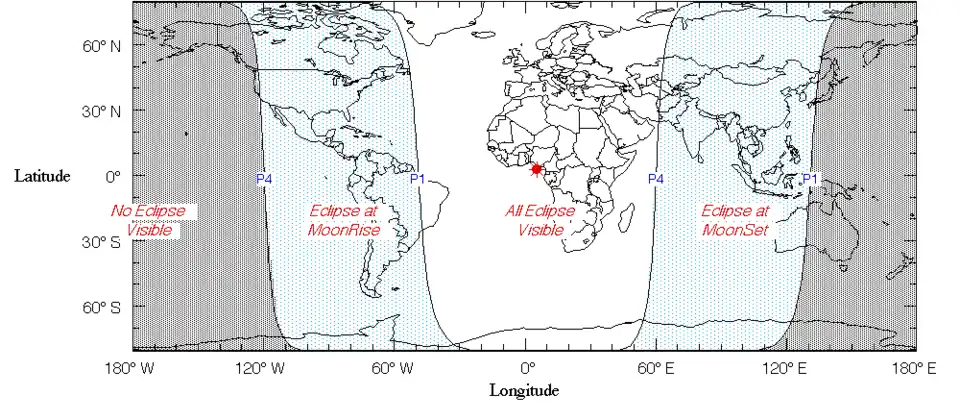 The eclipse was completely visible much of Africa, eastern South America, Europe, and west Asia, seen rising over North and South America and setting over much of Asia and western Australia.[3]