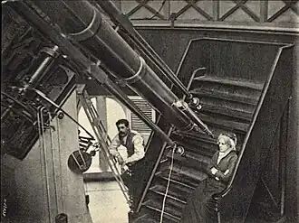 In 1836, Mitchell began working as the first librarian of the Nantucket Atheneum, a position she held for 20 years.[15][16][6] The institution's limited operating hours enabled Mitchell to assist her father with a series of astronomical observations and geographical calculations for the United States Coast Survey and to continue her own education.[6][5] Mitchell and her father worked in a small observatory constructed on the roof of the Pacific Bank building with a four-inch equatorial telescope provided by the survey.[6][5] In addition to looking for nebulae and double stars, the pair produced latitudes and longitudes by calculating the altitudes of stars and the culminations and occultations of the moon, respectively.[6]