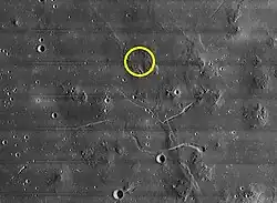 A site in the northern Marius Hills, located in the center of a five-kilometer circle in a shallow valley between four domes near a small sinuous depression, was one of nine potential Apollo landing sites studied in-depth as part of a 1968 Bellcom report describing the geology of those nine locations and potential mission plans. This site in particular, the Bellcom study suggested, could have offered the opportunity for up-close examination of planetary ridges similar to those located at the bottoms of Earth's oceans and sampling of a variety of material from the Moon's interior churned up during the area's highly active volcanic past.[12] The Bellcom study referenced an earlier 1968 study, prepared by the United States Geological Survey, that outlined a detailed mission plan for the proposed site. This plan included four EVAs using a Lunar Roving Vehicle and Lunar Flying Units for increased mobility in sampling the various features in the site radius.[13]