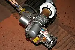 After the parachute was deployed at an altitude of about 10 km (6.2 mi) above the surface, the heatshield was released using 6 separation nuts and push-off springs. The lander then separated from the backshell and "rappelled" down a metal tape on a centrifugal braking system built into one of the lander petals. The slow descent down the metal tape placed the lander in position at the end of another bridle (tether), made of a nearly 20 m (66 ft) long braided Zylon.[40] Zylon is a fiber material, similar to Kevlar, that is sewn in a webbing pattern (like shoelace material) to make it stronger. The Zylon bridle provides space for airbag deployment, distance from the solid rocket motor exhaust stream, and increased stability. The bridle incorporates an electrical harness that allows the firing of the solid rockets from the backshell as well as provides data from the backshell inertial measurement unit (which measures rate and tilt of the spacecraft) to the flight computer in the rover.[40]
