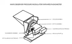Uses narrow-band radiometric channels and two pressure modulation cells to measure atmospheric and surface emissions in the thermal infrared and a visible channel to measure dust particles and condensates in the atmosphere and on the surface at varying longitudes and seasons.[15]