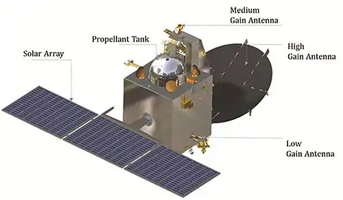 - Bus: The spacecraft's bus is a modified I-1 K structure and propulsion hardware configuration, similar to Chandrayaan-1, India's lunar orbiter that operated from 2008 to 2009, with specific improvements and upgrades needed for a Mars mission.[52] The satellite structure is constructed of an aluminium and composite fibre reinforced plastic (CFRP) sandwich construction.[55]