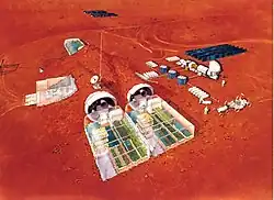 A Mars habitat is a hypothetical place where humans could live on Mars.[2][3] Mars habitats would have to contend with surface conditions that include almost no oxygen in the air, extreme cold, low pressure, and high radiation.[4] Alternatively, the habitat might be placed underground, which helps solve some problems but creates new difficulties.[5]