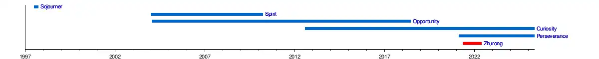 As of May 2021, there have been six successful robotically operated Mars rovers; the first five, managed by the American NASA Jet Propulsion Laboratory, were (by date of Mars landing): Sojourner (1997), Spirit (2004–2010), Opportunity (2004–2018), Curiosity (2012–present), and Perseverance (2021–present). The sixth, managed by the China National Space Administration, is Zhurong (2021–2022).