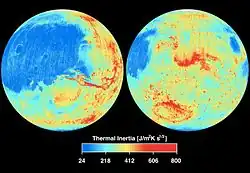 Thermal inertia values for most of the Martian surface are inversely related to albedo. Thus, high albedo areas have low thermal inertias indicating surfaces that are covered with dust and other fine granular material. The dark gray, low albedo surfaces have high thermal inertias more typical of consolidated rock. However, thermal inertia values are not high enough to indicate widespread outcroppings are common on Mars. Even the rockier areas appear to be mixed with a significant amount of loose material.[13] Data from the Infrared Thermal Mapping (IRTM) experiment on the Viking orbiters identified areas of high thermal inertia throughout the interior of Valles Marineris and the chaotic terrain, suggesting that these areas contain a relatively large number of blocks and boulders.[14][15]