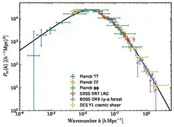 The broad shape of the matter power spectrum is determined by the growth of large-scale structure, with the turnover (the point where the spectrum goes from increasing with k to decreasing with k) at , corresponding to (where h is the dimensionless Hubble constant).[4] The co-moving wavenumber corresponding to the maximum power in the mass power spectrum is determined by the size of the cosmic particle horizon at the time of matter-radiation equality, and therefore depends on the mean density of matter and to a lesser extent on the number of neutrino families (), , for . The at smaller k (equivalently, larger scales) corresponds to scales which were larger than the particle horizon at the time of the transition from the regime of radiation dominance to that of matter dominance.[5][6] At linear order in perturbations , the power spectrum's broad shape follows