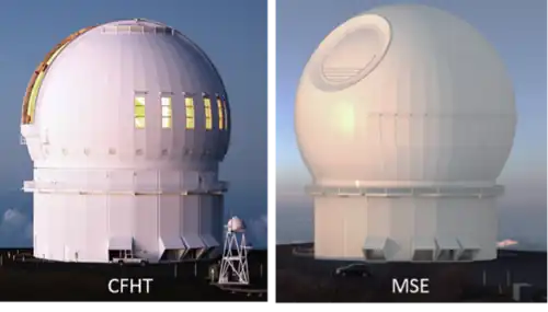 The MSE telescope will use an altitude-azimuth telescope mount supporting a segmented primary mirror with an effective aperture diameter of 10 meters. The mount concept is executed as a yoke-type structure and open space-frame telescope tube providing very good mechanical performance.[10] The telescope is optically designed to be a prime focus telescope using a segmented primary mirror of 60 1.44m segments, delivering a circumscribed 11.25 meter aperture, and with a five element widefield corrector providing 1.5 square degrees of corrected field of view at the prime focus optical focal surface of the telescope. Compensation for atmospheric dispersion is an integral function of the widefield corrector optics. MSE's 11.25 meter aperture diameter necessitates replacing Canada-France-Hawai‘i Telescope's enclosure, designed for a 3.6 meter aperture telescope, with one that provides a suitable enclosure aperture while still being of a mass that the current building can support. A calotte style enclosure[11] has been chosen as one that meets performance requirements, including good control of ventilation, while staying within the allowed mass and fiscal budgets.