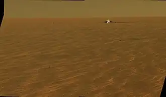 ![]() Mars Exploration Rover Opportunity looks across the smooth soil of Meridiani Planum, towards the discarded heat shield of the rover's lander | |
