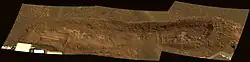 Figure 6. Burns Cliff in Endurance Crater. This image is one of the best known by Opportunity's Pancam. The original file is a huge (12,316 x 4,218 pixels) "mosaic" of many images. It has a "fish eye" view distortion. Click on the image for higher resolution. Burns Cliff is at least 7 m tall.[34] Meridiani sediment cliffs as big as Burns Cliff are not common. They only occur in large Meridiani craters younger than the sediments. The sediments in Burns Cliff are more weathered than those in Figure 5 since Endurance Crater is much older than Concepcion Crater.[24] Opportunity collected data at Burns Cliff over several months in 2004, and many important papers used this data.[34]<ref name='Squyres_2004'>