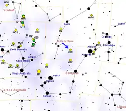 Messier 19 or M19 (also designated NGC 6273) is a globular cluster in the constellation Ophiuchus. It was discovered by Charles Messier on June 5, 1764[6] and added to his catalogue of comet-like objects that same year. It was resolved into individual stars by William Herschel in 1784. His son, John Herschel, described it as "a superb cluster resolvable into countless stars".[7] The cluster is located 4.5° WSW of Theta Ophiuchi and is just visible as a fuzzy point of light using 50 mm (2.0 in) binoculars. Using a telescope with a 25.4 cm (10.0 in) aperture, the cluster shows an oval appearance with a 3 × 4 core and a 5 × 7 halo.[6]