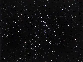 Messier 48 or M48, also known as NGC 2548, is an open cluster of stars in the equatorial constellation of Hydra. It sits near Hydra's westernmost limit with Monoceros,[7] about 18° 34′ to the east and slightly south of Hydra's brightest star, Alphard.[8] This grouping was discovered by Charles Messier in 1771, but there is no cluster precisely where Messier indicated; he made an error, as he did with M47. The value that he gave for the right ascension matches, however, his declination is off by five degrees.[9] Credit for discovery is sometimes given instead to Caroline Herschel in 1783.[9] Her nephew John Herschel described it as, "a superb cluster which fills the whole field; stars of 9th and 10th to the 13th magnitude – and none below, but the whole ground of the sky on which it stands is singularly dotted over with infinitely minute points".[8]