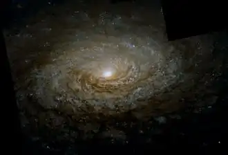 The shape or morphology of this galaxy has a classification of SAbc,[8] indicating a spiral form with no central bar feature (SA) and moderate to loosely wound arms (bc). There is a general lack of large-scale continuous spiral structure in visible light, so it is considered a flocculent galaxy. However, when observed in the near infrared, a symmetric, two-arm structure is seen. Each arm wraps 150° around the galaxy and extends out to 13,000 light-years (4,000 parsecs) from the nucleus.[9]