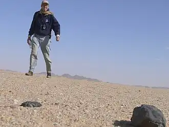 A meteorite is a portion of a meteoroid or asteroid that survives its passage through the atmosphere and hits the ground without being destroyed.[22] Meteorites are sometimes, but not always, found in association with hypervelocity impact craters; during energetic collisions, the entire impactor may be vaporized, leaving no meteorites. Geologists use the term, "bolide", in a different sense from astronomers to indicate a very large impactor. For example, the USGS uses the term to mean a generic large crater-forming projectile in a manner "to imply that we do not know the precise nature of the impacting body ... whether it is a rocky or metallic asteroid, or an icy comet for example".[23]