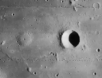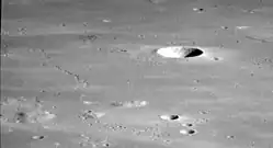 ![]() Lunar Orbiter 4 image of Milichius crater (right) and Milichius Pi lunar dome(left) (horizontal rows of spots are blemishes on original) | |