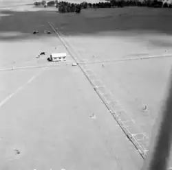 The Mills Cross at Fleurs, looking S along part of the N-S arm, with the receiver house conspicuous at the centre of the array. A fence around the array kept the animals out.