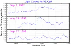 Mira B, also known as VZ Ceti, is the companion star to the variable star Mira, separated by around 100 AU. Suspected as early as 1918, it was visually confirmed in 1923 by Robert Grant Aitken, and has been observed more or less continually since then, most recently by the Chandra X-Ray Observatory.[5]