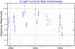 Mirach is a single,[19] aging red giant with a stellar classification of M0 III.[4] It is currently on the asymptotic giant branch of its evolution.[3] The star has an estimated 2.49[12][5] times the mass of the Sun. Having exhausted the supply of hydrogen at its core, the outer envelope of the star has expanded to around 86 times the size of the Sun. It is radiating 1,675 times the luminosity of the Sun at an effective temperature of 3,802 K.[5] Mirach is suspected of being a semiregular variable star, with an apparent visual magnitude varies from +2.01 to +2.10.[2] Since 1943 the spectrum of this star has been one of the stable anchor points by which other stars are classified.[20]