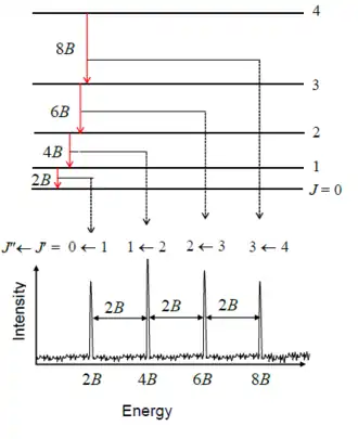 The molecules listed below were detected through astronomical spectroscopy. Their spectral features arise because molecules either absorb or emit a photon of light when they transition between two molecular energy levels. The energy (and thus the wavelength) of the photon matches the energy difference between the levels involved. Molecular electronic transitions occur when one of the molecule's electrons moves between molecular orbitals, producing a spectral line in the ultraviolet, optical or near-infrared parts of the electromagnetic spectrum. Alternatively, a vibrational transition transfers quanta of energy to (or from) vibrations of molecular bonds, producing signatures in the mid- or far-infrared. Gas-phase molecules also have quantised rotational levels, leading to transitions at microwave or radio wavelengths.[1]