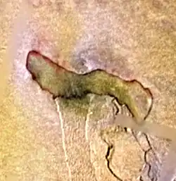 Monan Patera forms an unusual worm-shaped depression at the north end of the elongate mountain Monan Mons, south of which is Ah Peku Patera. To the west is the eruptive center Amirani, and to the north is Skythia Mons. To the east are Gish Bar Patera, Gish Bar Mons, and Estan Patera.[2] Monan Patera's similar north and south margins indicate it may have formed as a pull-apart basin and subsequently was filled with lava.[3]