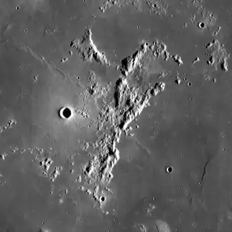 Montes Riphaeus (Latin for "Riphaeus Mountains") is an irregular range of lunar mountains that lie along the west-northwestern edge of Mare Cognitum, on the southeastern edge of Oceanus Procellarum. The range trends generally from north-northeast to south-southwest. It includes a number of slender ridge lines with valleys flooded by intruding flows of lava.[1]
