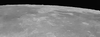 ![]() Oblique view of Montes Secchi, facing south. The crater Secchi is below left of center, Mare Fecunditatis is at left, and Mare Tranquillitatis is at right. | |