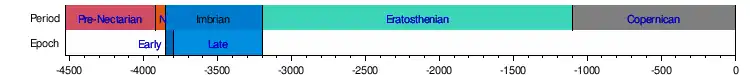 The lunar geological periods are named after their characteristic features, from most impact craters outside the dark mare, to the mare and later craters, and finally the young, still bright and therefore readily visible craters with ray systems like Copernicus or Tycho.
