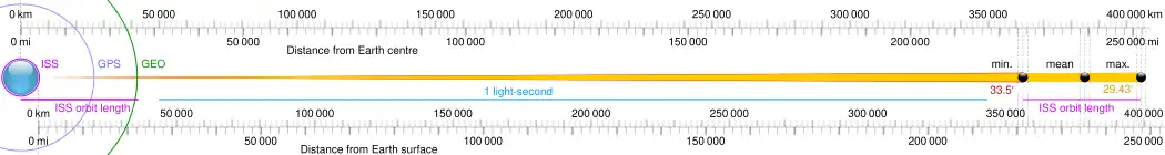 Semi-major axis | 384399 km (1.28 ls; 1/389 AU; 1 LD)[1] | ||||||||||||
