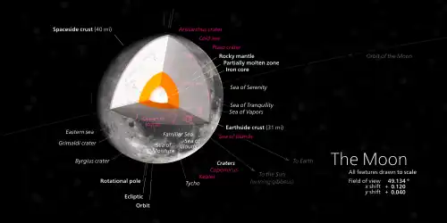 The Moon is a differentiated body that was initially in hydrostatic equilibrium but has since departed from this condition.[73] It has a geochemically distinct crust, mantle, and core. The Moon has a solid iron-rich inner core with a radius possibly as small as 240 kilometres (150 mi) and a fluid outer core primarily made of liquid iron with a radius of roughly 300 kilometres (190 mi). Around the core is a partially molten boundary layer with a radius of about 500 kilometres (310 mi).[74][75] This structure is thought to have developed through the fractional crystallization of a global magma ocean shortly after the Moon's formation 4.5 billion years ago.[76]