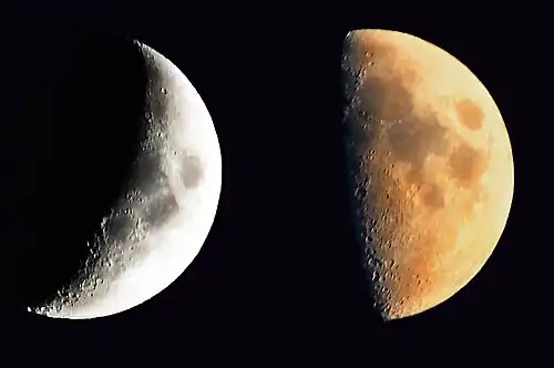 The Moon is, except when passing through Earth's shadow during a lunar eclipse, always illuminated by the Sun, but from Earth the visible illumination shifts during its orbit, producing the lunar phases.[18] The Moon is the brightest celestial object in Earth's night sky. This is mainly due to its large angular diameter, while the reflectance of the lunar surface is comparable to that of asphalt. The apparent size is nearly the same as that of the Sun, allowing it to cover the Sun completely during a total solar eclipse. From Earth about 59% of the lunar surface is visible due to cyclical shifts in perspective (libration), making parts of the far side of the Moon visible.