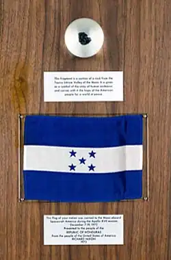 Apollo 17 astronauts Eugene Cernan and Harrison Schmitt picked up a rock "composed of many fragments, of many sizes, and many shapes, probably from all parts of the Moon". This rock was later labeled sample 70017.[30] President Nixon ordered that fragments of that rock should be distributed in 1973 to all 50 US states and 135 foreign heads of state. The fragments were presented encased in an acrylic sphere, mounted on a wood plaque which included the recipients' flag which had also flown aboard Apollo 17.[31] Many of the presentation Moon rocks are now unaccounted for, having been stolen or lost.