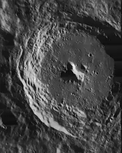 The rim of the crater has a wide, terraced inner wall, and a complex outer rampart. The floor has been partly resurfaced and is relatively flat. In the middle is a central mountain formation that rises about 2.1 kilometers above the surrounding floor.