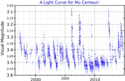 The spectrum of Mu Centauri is considered to be a standard for a B2 Be star with the stellar classification of B2V:e.[4] The 'e' suffix is used to mark the presence of emission lines, caused by a circumstellar disk of hot gas that was formed from material ejected from the star. Mu Centauri is a pulsating variable star that has multiple non-radial cycles with a primary period of 0.503 days. Three other pulsation cycles have a similar period, while two have a shorter interval of about 0.28 days. It undergoes outburst events that result in the transfer of additional material to the surrounding disk.[11] During these outbursts, the star can experience transient periodicities.[12] Mu Centauri is classified as a Gamma Cassiopeiae type variable star and its brightness varies from magnitude +2.92 to +3.49.[3]